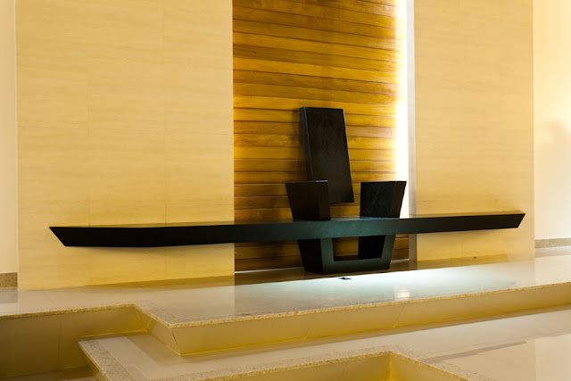 Pela luz que se faz no interior do corte na parede de fundos, vislumbra-se o símbolo maior da fé cristã, de forma simples e bela, símbolo que intitula a paróquia. A Santa Cruz.