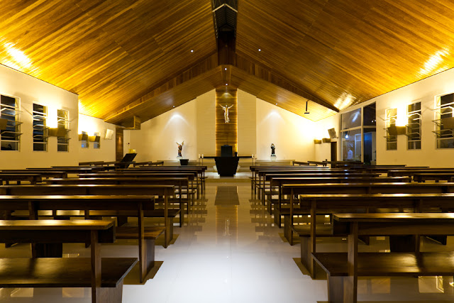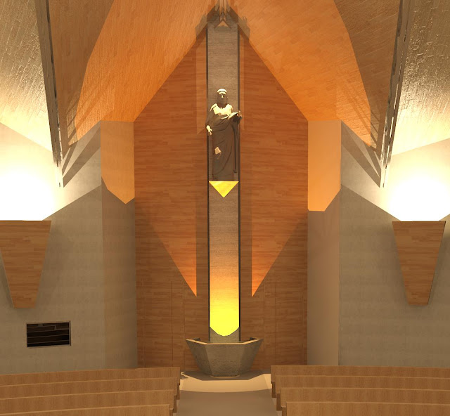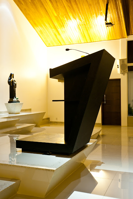 Os patamares do presbitério focam na hierarquia dos elementos litúrgicos. O batistério encontra-se junto à assembléia, a capela do santíssimo e os santos, a dois degraus de altura.