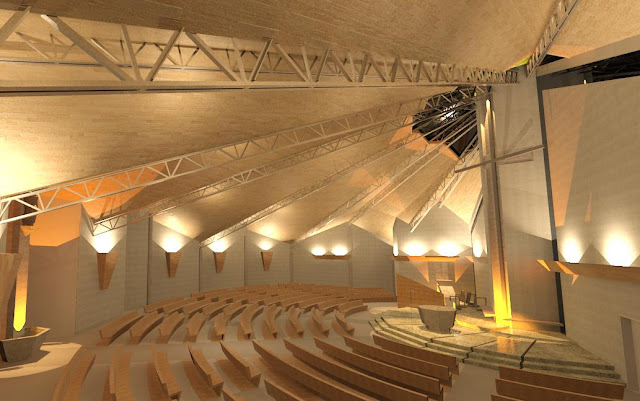 ■ A O projeto passou por uma reformulação do layout das salas anexas a nave. Foram criadas nas laterais do presbitério: Sacristia, capela do santíssimo e sala de controle de som e luz. Aos fundos: Capela da reconciliação [o antigo confessionário], sala de dízimo, Sacristia e sala de imagens.